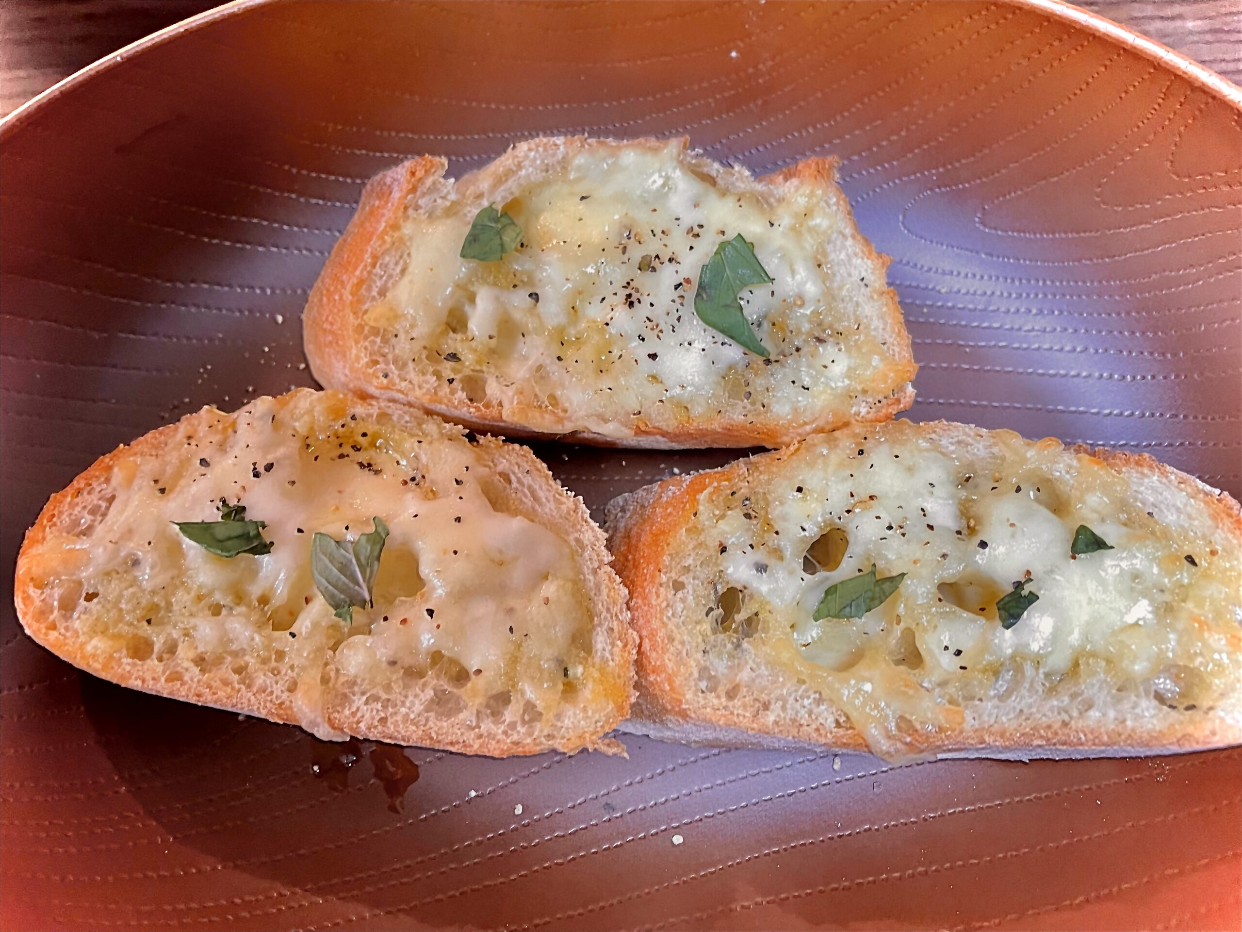 今回はガーリックトーストにチーズと香草(ミント)をのせるアレンジをしました。